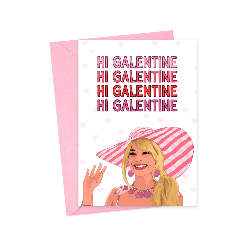 Celebrate Galentine's Day with a touch of playful charm with our "R is for Robo Barbie Galentine Greeting Card." This delightful card features a vibrant illustration of Margot Robbie from the Barbie movie adorned in a large pink and white striped hat and a chic pink necklace, set against a white background adorned with pink hearts. The repeated greeting "HI GALENTINE" in varying shades of pink and red adds a fun and affectionate touch. Perfect for expressing your love and admiration, this card comes with a matching pink envelope, making it a complete package for your special someone.